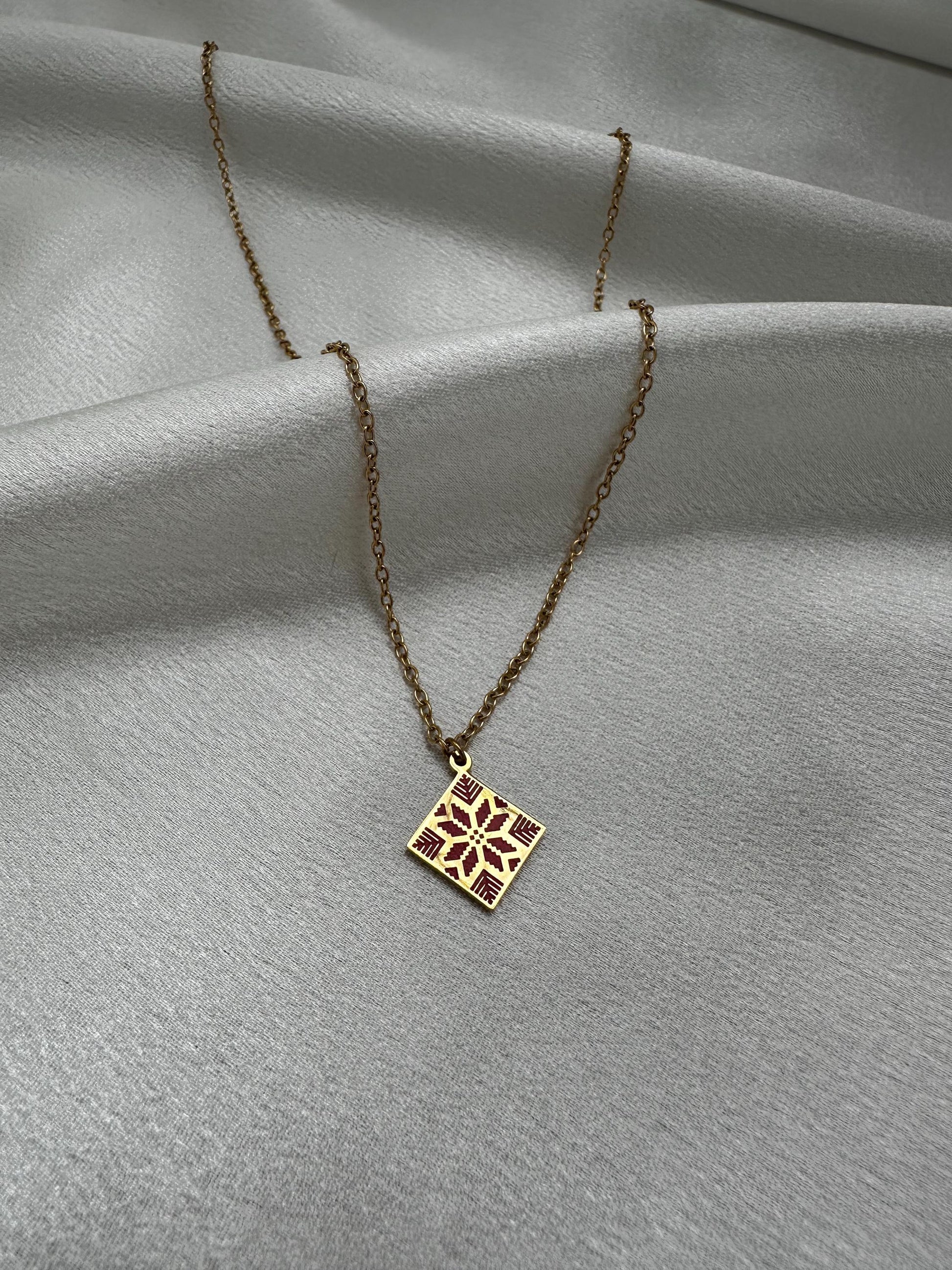 Tatreez (تطريز), the traditional Palestinian embroidery, is more than just a craft—it's a symbol of resilience, heritage, and identity. Passed down through generations, Palestinian women have meticulously stitched these intricate patterns, each telling a story of their roots, villages, and personal journeys. This handcrafted Tatreez necklace honors a rich tradition, seamlessly blending history with modern elegance. Whether worn as a symbol of pride or a tribute to the artistry of Palestinian women, it reflects a culture that perseveres and thrives through generations.